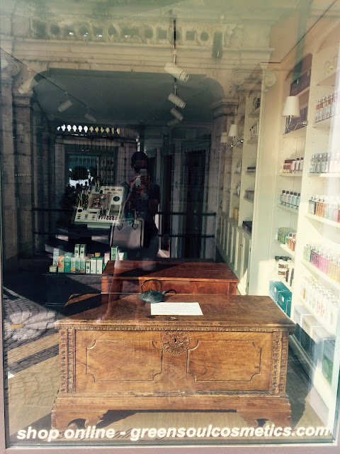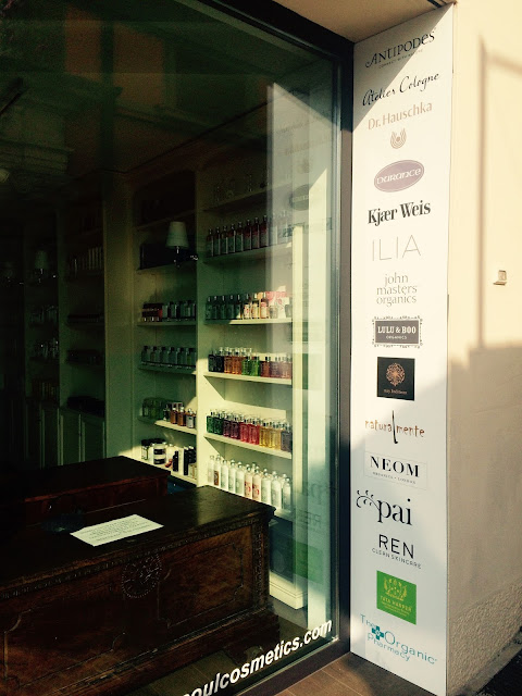 Jednak szybko ogarnęła mnie rozpacz, bo się okazało, że w środku jest ciemno. Przykleiłam nos do ogromnej szyby, ale niestety nie dostrzegłam w środku żywej duszy. Słońce pięknie świeci, ludzie spacerują, łódki pływają, a sklep zamknięty. No trudno. Zrobiłam więc klasyczny „window shopping”, czyli przykleiłam pół twarzy do witryny i starałam się pochłonąć wzrokiem wszystkie kosmetyki, jakie wpadły w moje pole widzenia. Kilka firm znałam, inne były dla mnie zupełnie nowe. Po chwili zorientowałam się, że oferta firm dostępnych w sklepie wypisana jest obok wystawowej szyby;) Zakupów nie było, ale przynajmniej udokumentowałam kolejny ekologiczny sklep, jakiego mi brakuje w Polsce.